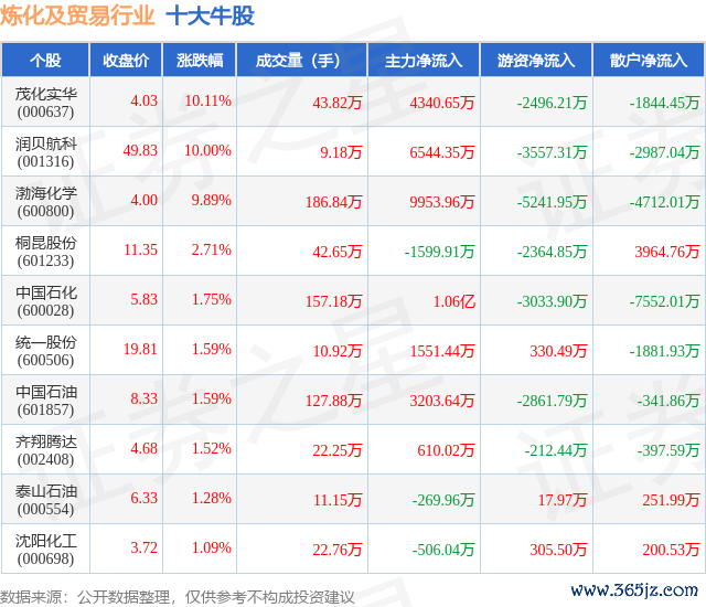 个股表现方面,炼化及贸易行业当日领涨股为茂化实华(000637),该股当日报收4.03,上涨10.11%,成交量43.82万,主力资金净流入4340.65万元。润贝航科(001316)以上涨10.0%紧随其后,该股当日成交量9.18万,主力资金净流入6544.35万元。除此之外,渤海化学(600800)、桐昆股份(601233)、中国石化(600028)均进入当日牛股之列。具体个股列表见下表: